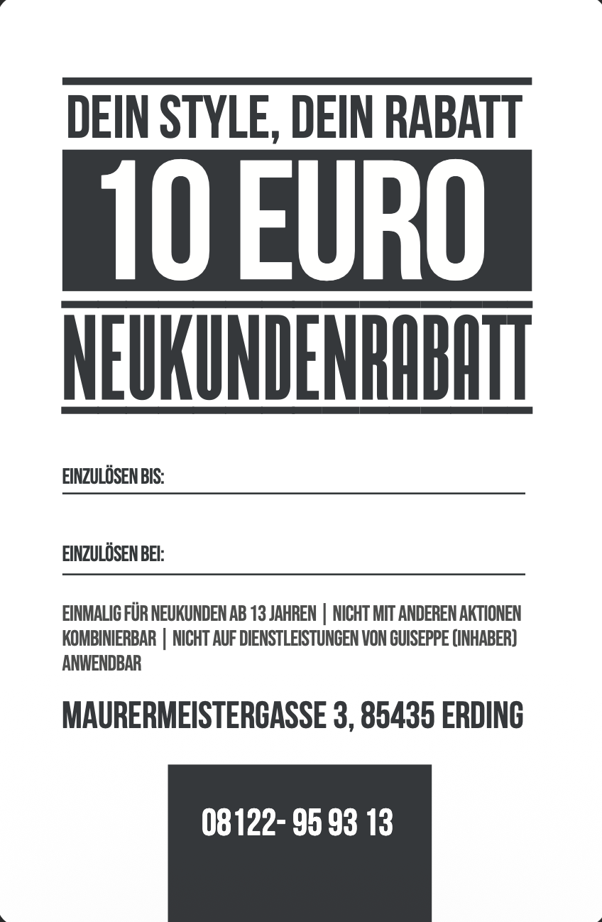 Wir schenken dir 10 € Rabatt auf deinen ersten Termin, als kleines Willkommensgeschenk bei uns. Ob klassischer Schnitt, saubere Konturen oder frischer Fade: Wir nehmen uns Zeit für deinen Style und sorgen dafür, dass du mit einem guten Gefühl rausgehst.